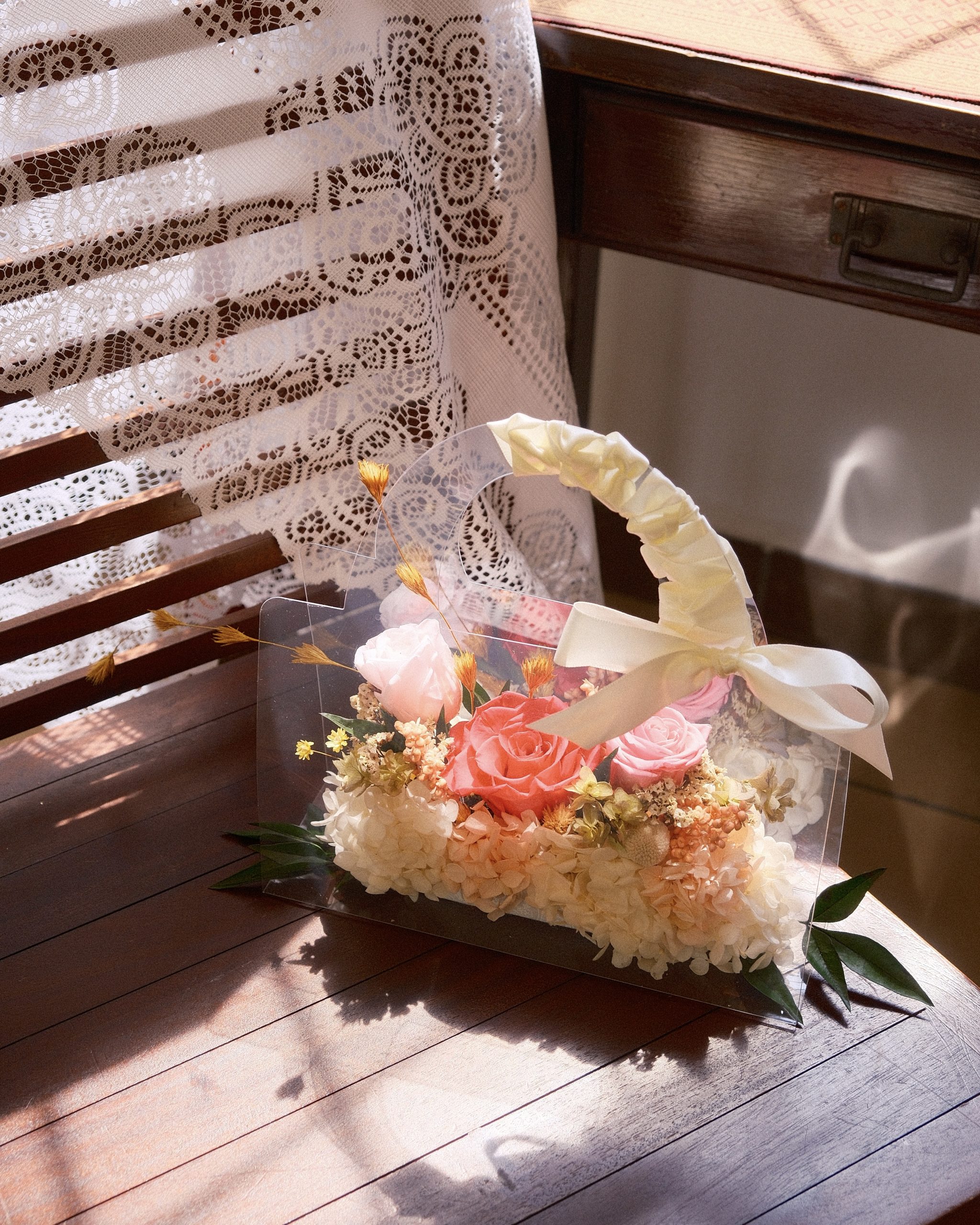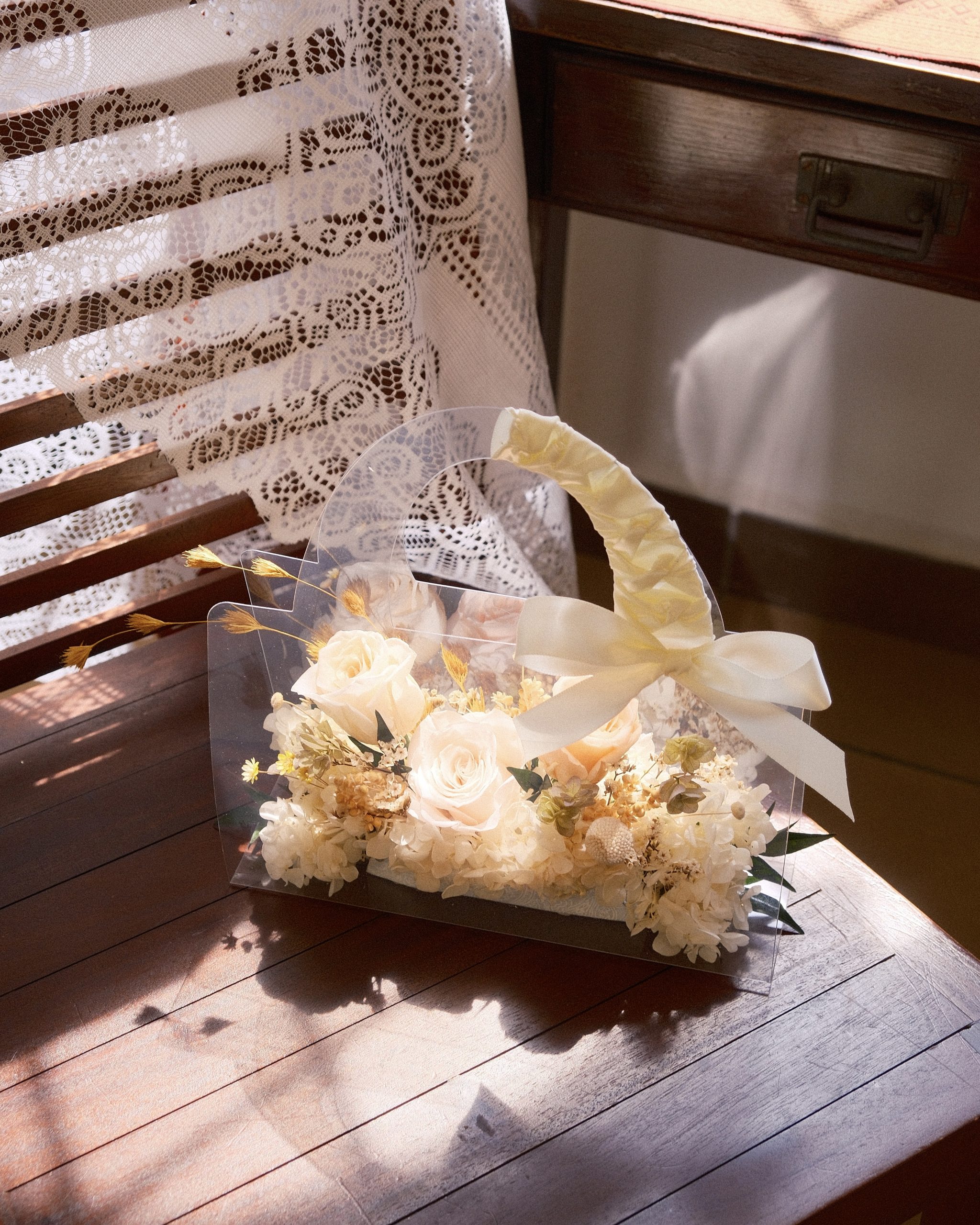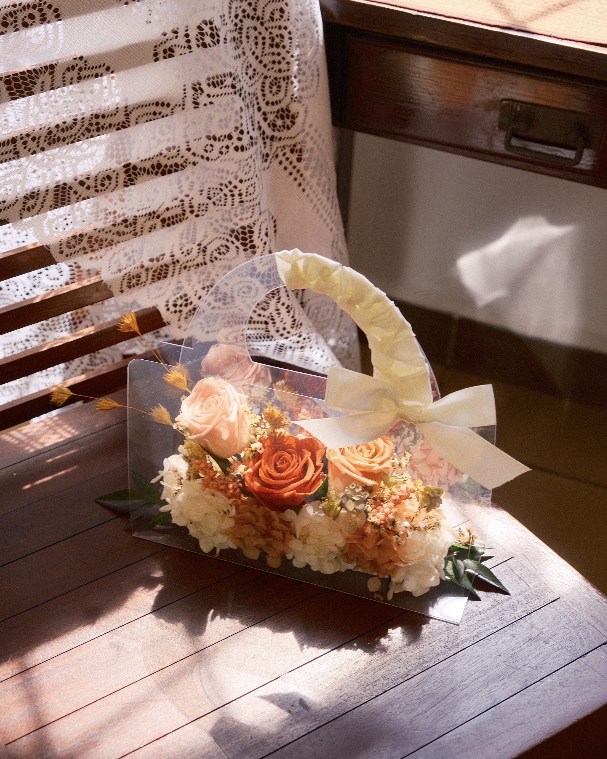 Each mini bag is fully handmade with preserved florals and finished with a delicate ribbon.